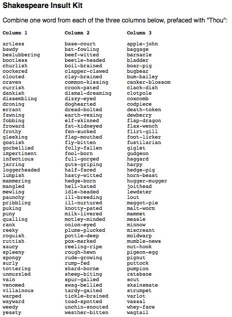 It doesn’t really actually mean all that much to me right now. I’m off of work for the next few days, unless I get called in to substitute for someone. In the meantime, I really should be looking for additional work, but there are so many things that demand for me to read them…seriously, it’s like an addiction. I can’t stop reading! That, and drinking Mountain Dew. And hopefully writing… Speaking of which, writing, that is, not Mountain Dew (though I realized the store had ten different varieties of Mountain Dew the other day, twelve if you counted the two diet flavors…), I found something that could come in very handy. If nothing else, I can use this for when I get into an argument with some gorbellied, motley-minded clack-dish: